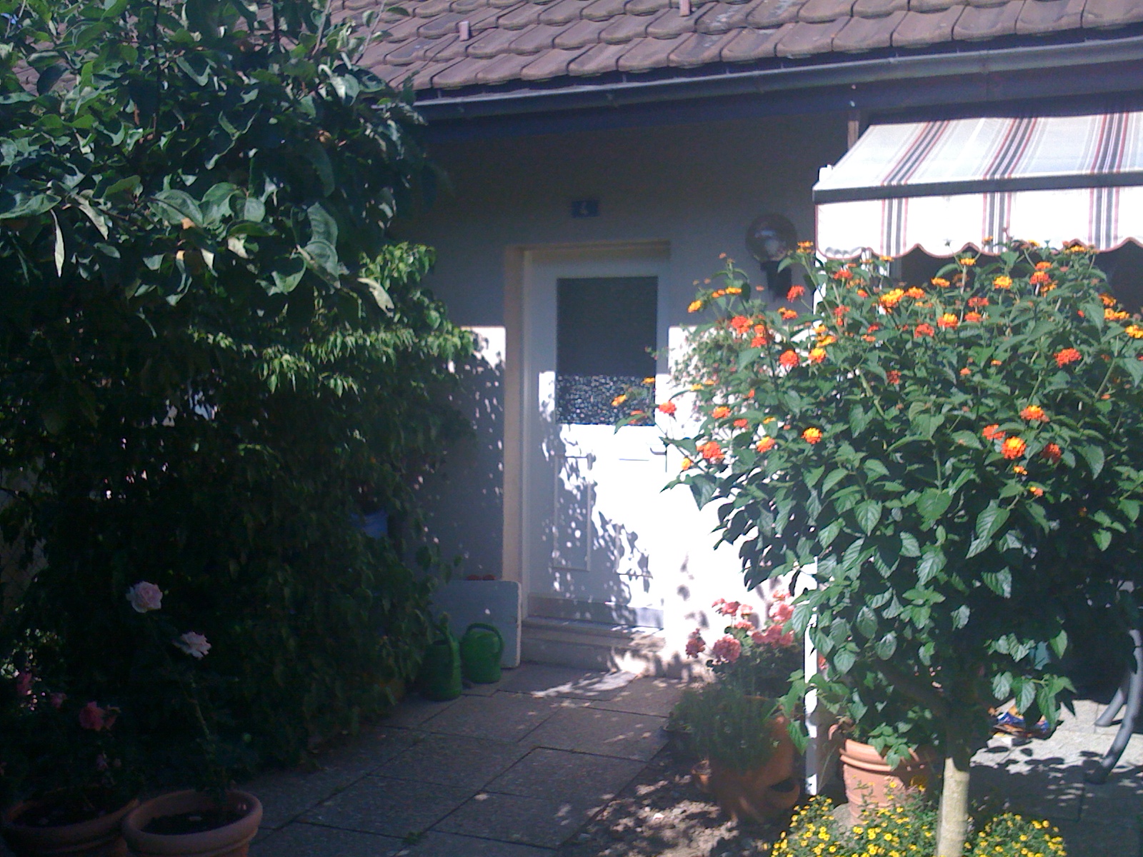 Von aussen ist es natürlich noch gleich geblieben, ausser, dass der Garten sich ein wenig verändert hat. So verwende ich für die Blumen kein Orange, sondern natürlich zarte Farben wie lila, weiss, rosa, bis hin zu stärkerem Violett und Weinrot. Obschon davon auch schon einiges Vorhanden war, wie zum Beispiel die wunderbare überrankte Rosenfassade.